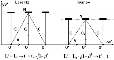 Fig. 8. Schemes for calculation of time deceleration: a) by Lorenz; b) by Ivanov