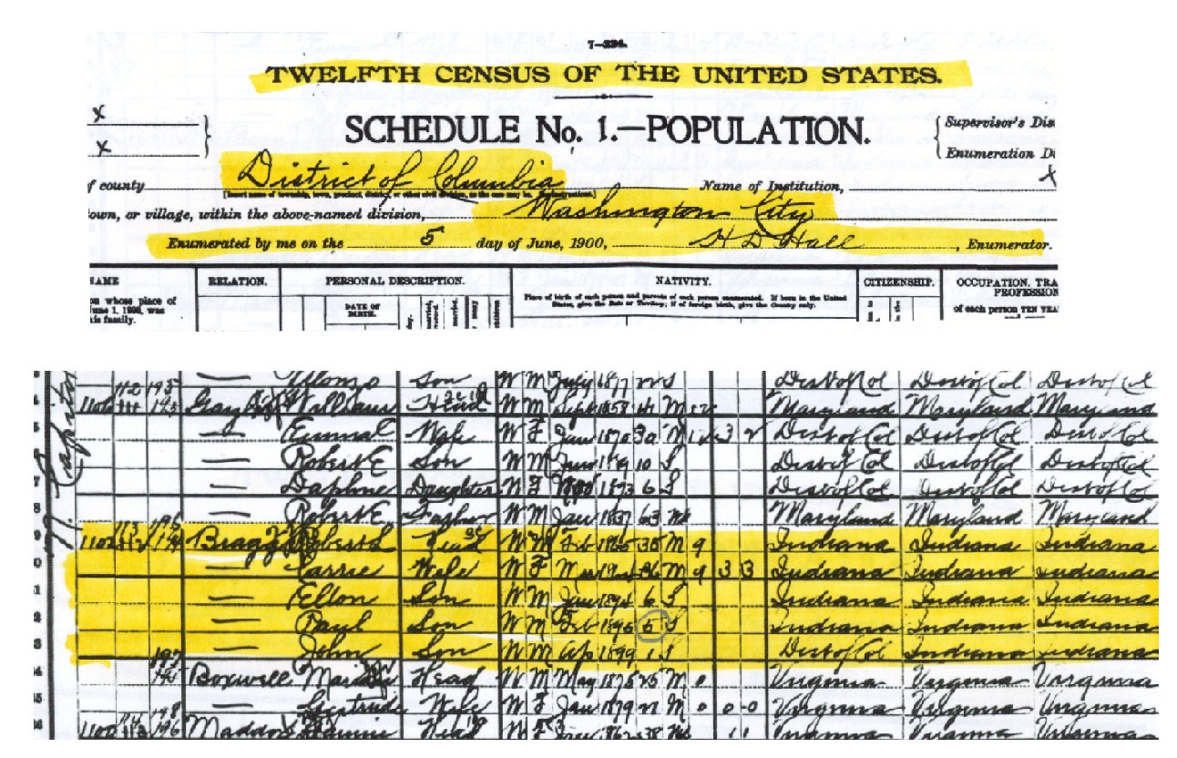 Paul’s heritage has been traced to Indiana since the mid-1800s, when his great grandfather, Andrew Bragg (not Braxton), moved there from Tennessee not long before Paul’s grandfather, James H. Bragg, was born.[16] The “family homestead in Virginia” claim appears false. Paul’s father was not a farmer, but a printer who worked for the U.S. government and moved to Washington D.C., where Paul was raised, in about 1898.
