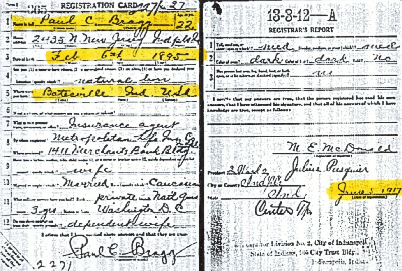 When this information came to light, some challenged it, suggesting that it was a different Paul C. Bragg. Below is Bragg’s 1917 draft card, signed by Bragg himself. Bragg presents his birthday as February 6, 1895, in Batesville, Indiana, and his profession as a life insurance salesman.[12]