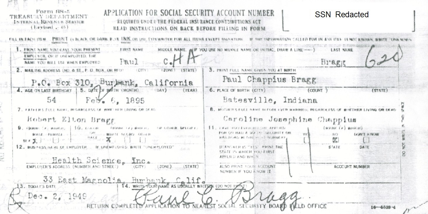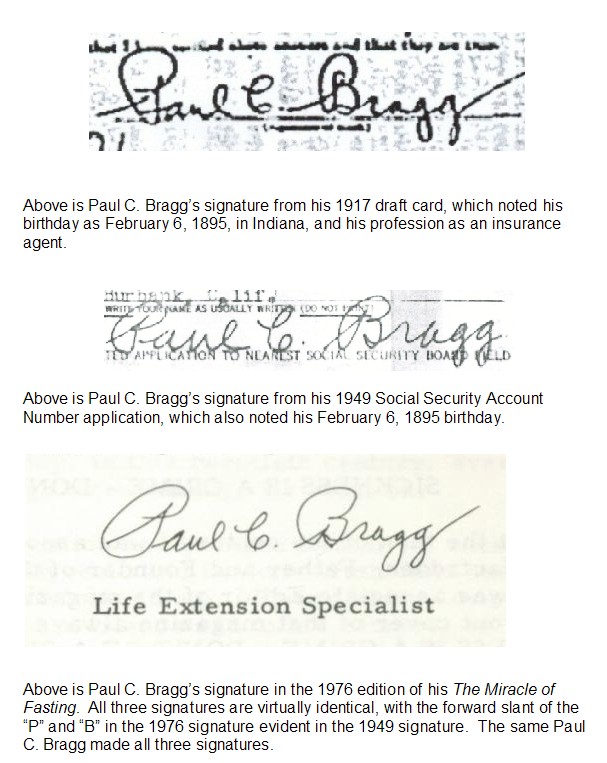 The signatures on the draft card and Social Security Number Application are virtually identical to the signature in Bragg’s books. See a comparison, below. It is the same Paul C. Bragg.