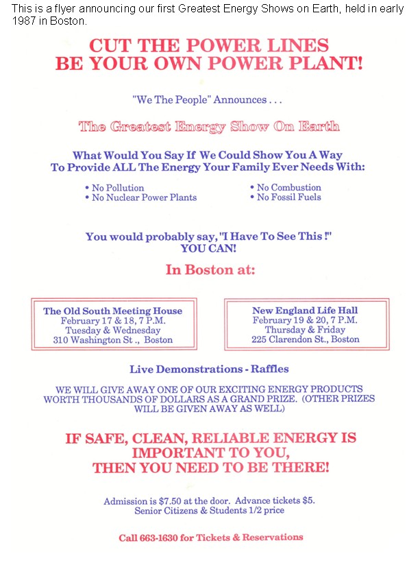 A couple of days before I arrived in Boston, Dennis got his WPPEE lightning bolt. When Dennis arrived in Boston, just like he did in Seattle, he tried working with the electric companies and energy establishment. People like Dennis never begin as rebels, but as believers in the system. Only after they are repeatedly crucified do they begin getting “political” and “rebellious,” because they have seen first-hand, and born the brunt of, how corrupt the system is. Ralph McGehee and Rodney Stich are similar, as was I. Dennis spoke at a Department of Energy hearing, and in the audience was a man who worked at a company that used a 200° F heat source to generate electricity. The exhaust temperature of the LamCo-style heat pump was about the same temperature. On Monday, the day after I got to Boston, Dennis and I drove to that company and visited with its president. We watched their turbine making electricity from that low-temperature heat source. It was then that Dennis began making his “free energy” noise. Dennis’ original idea was marrying his heat pump to that low-temperature heat engine to make free electricity. He called his idea “Low Temperature Phase Change.” At that time, Dennis knew nearly nothing about thermodynamics and had never heard of Carnot, but he put on his P.T. Barnum hat. Before long, we were preparing to put on “The Greatest Energy Show on Earth.” Below is an image from our first show. Those were happy and innocent days for me.