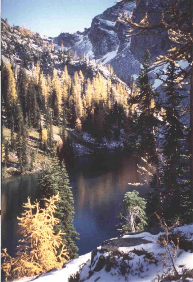 The first image is below Shepherd's Pass in the Sierra Nevada range, 1990. John Muir Trail is in the distance. Awesome country. The second image records one of the more sublime moments of my life. It was taken at Blue Lake on October 16, 1999, on the back side of Liberty Bell Mountain in North Cascades National Park. The golden trees are larches, which are deciduous conifers. Finding larches in autumn foliage (the needles are very soft) on a clear day is not easy to do. Those were the first autumn larches that I had ever seen in person. After many years of longing for a sight of the autumn larches, I finally experienced it. The third photo is of a larch grove near Blue Lake. I climbed off trail and into a grove of them and hung out with the golden larches. It will always be a vivid memory.