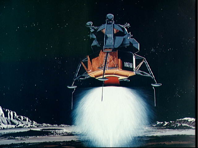 Figure 11. Astronaut Edwin E. Aldrin, Jr., Apollo 11 Lunar Module Pilot, stepping onto the lunar surface. The astronauts quickly adapted to movement in lunar gravity, adopting a loping gait, a kind of kangaroo hop, as the most efficient for negotiating the lunar surface. They collected approximately 21 kg (46 lb) of rock and soil samples and set up the Apollo Early Surface Experiment Package (ESEP). The scientific payload consisted of a passive seismometer, a direct Earth-moon communications link, a solar wind experiment designed to isolate exotic gases in the solar wind, such as argon and krypton, for return to Earth for analysis; and an array of optical reflectors serving as targets for laser pointing systems on Earth, with the objective of more precisely measuring the distance between the Earth and the moon. After two and one-half hours of work on the lunar surface, the astronauts returned to the Lunar Module. Several hours later, the Lunar Module ascent stage was launched; it docked about three and one-half hours afterwards with the Command Module. During the return flight to Earth, the crew vacuum cleaned their clothing and equipment and took numerous precautions as part of a quarantine program to avoid carrying back to Earth any possible contamination from the moon. On Thursday, [30] July 24, after an eight-day mission, the crew splashed down in the Pacific Ocean. They donned biological isolation garments and were recovered by helicopter and transferred to the recovery ship USS Hornet where they were placed in a Mobile Quarantine Facility, a trailer modified for the purpose. They traveled in the MQF to the Lunar Receiving Laboratory in Houston, where they were kept in isolation for 21 days after lift-off from the lunar surface to preclude the possibility of contaminating the Earth with lunar organisms or material. Extensive medical and biological tests determined that no harmful organisms were present in any of the materials returned from the moon, and quarantine was terminated. The materials returned from the 1 533 225 km (952 700 mile) journey to the moon and back were distributed to 144 scientists throughout the world. Figure 12 illustrates material from lunar rock. Among the scientific findings reported was the fact that the moon is approximately 4.6 billion years old.** The presence of minute deposits of gold , silver, and rubies in the lunar rilles was established, and evidence was found indicating that there were lava flows on the moon at one time. Additionally, three new mineral elements were discovered in the Apollo 11 samples analysis. Artists concept of Apollo 11 Lunar Module ascent stage launched from moon